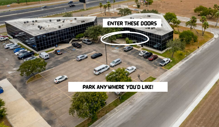 From S. Padre Island Dr access road, we are the second all black glass building with “400” in white on the corner of the building. Park between the two buildings and we are on the second floor, last door on the right #206.